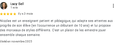 Mon approche ludique et mon suivi approfondi permettent de maintenir la motivation des élèves tout en explorant divers styles musicaux. Je propose également des cours de MAO (Musique Assistée par Ordinateur) incluant des techniques d'enregistrement et de mixage, intégrés selon les besoins et les envies des élèves.